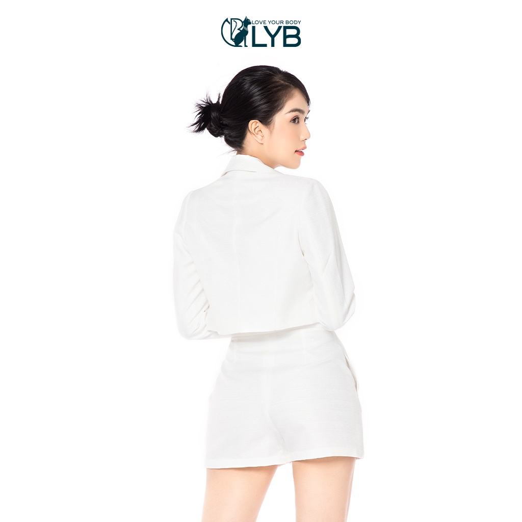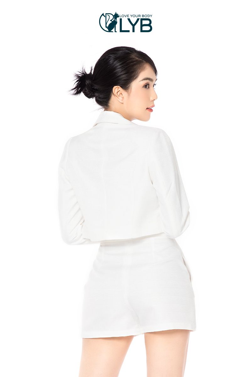 - Set gồm áo khoác vest kiểu dáng crop mưới lạ kết hợp cùng quần short xoè và áo bra bên trong cá tính